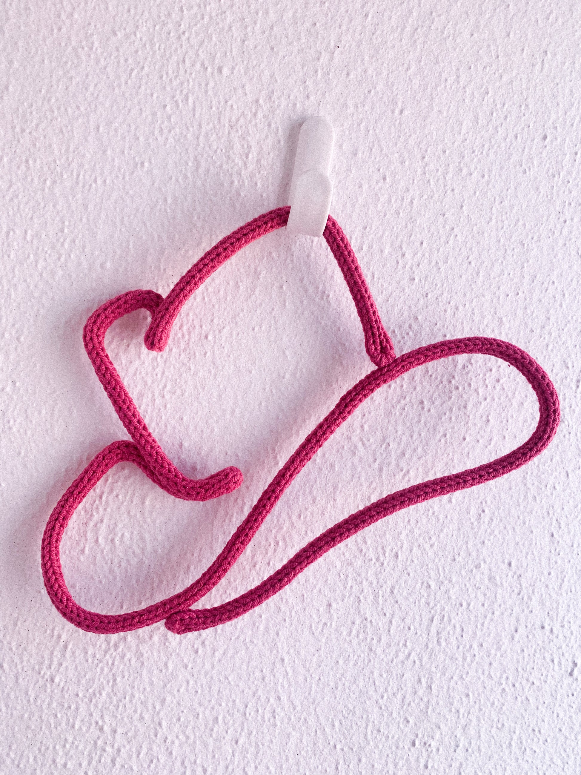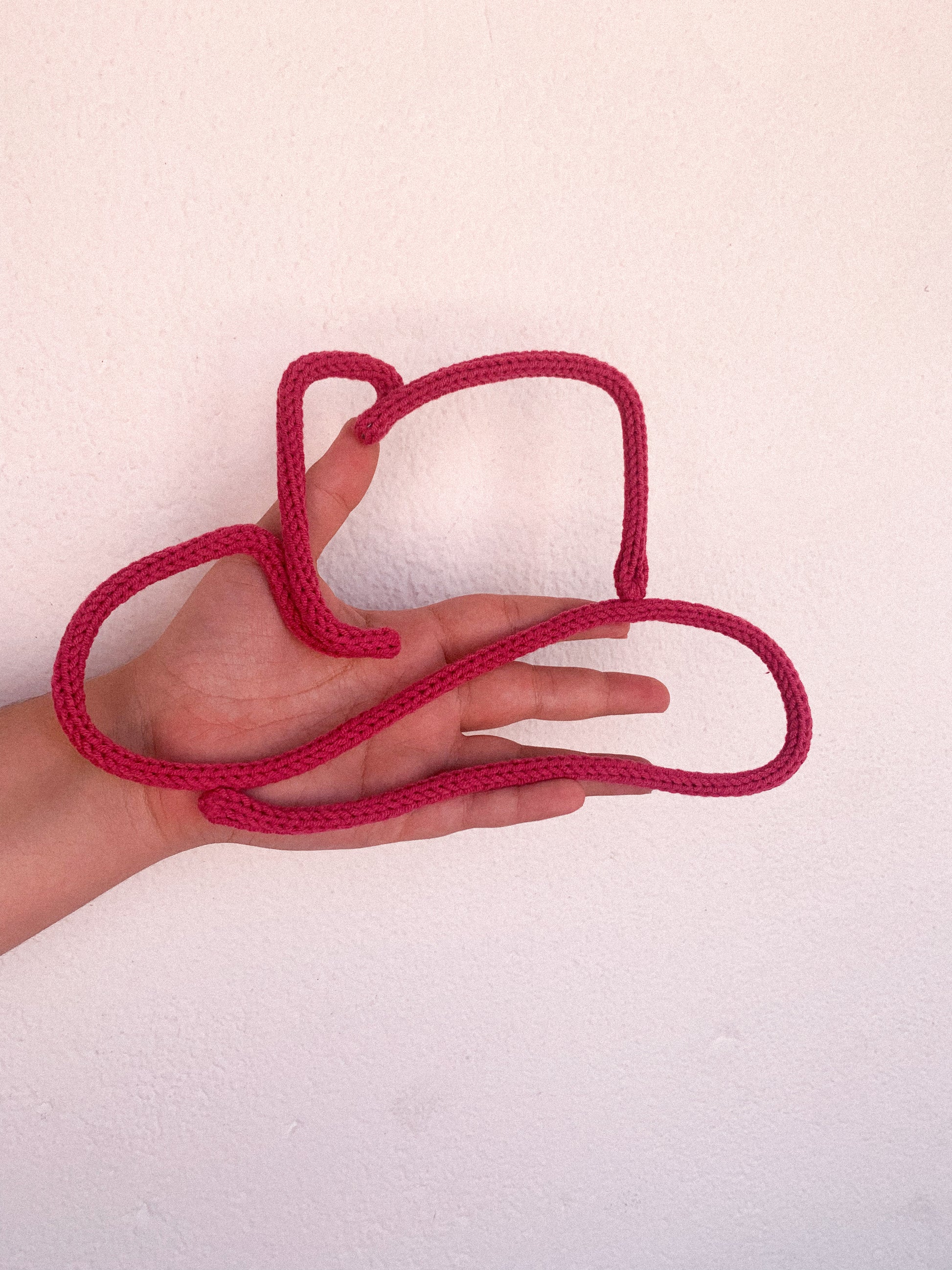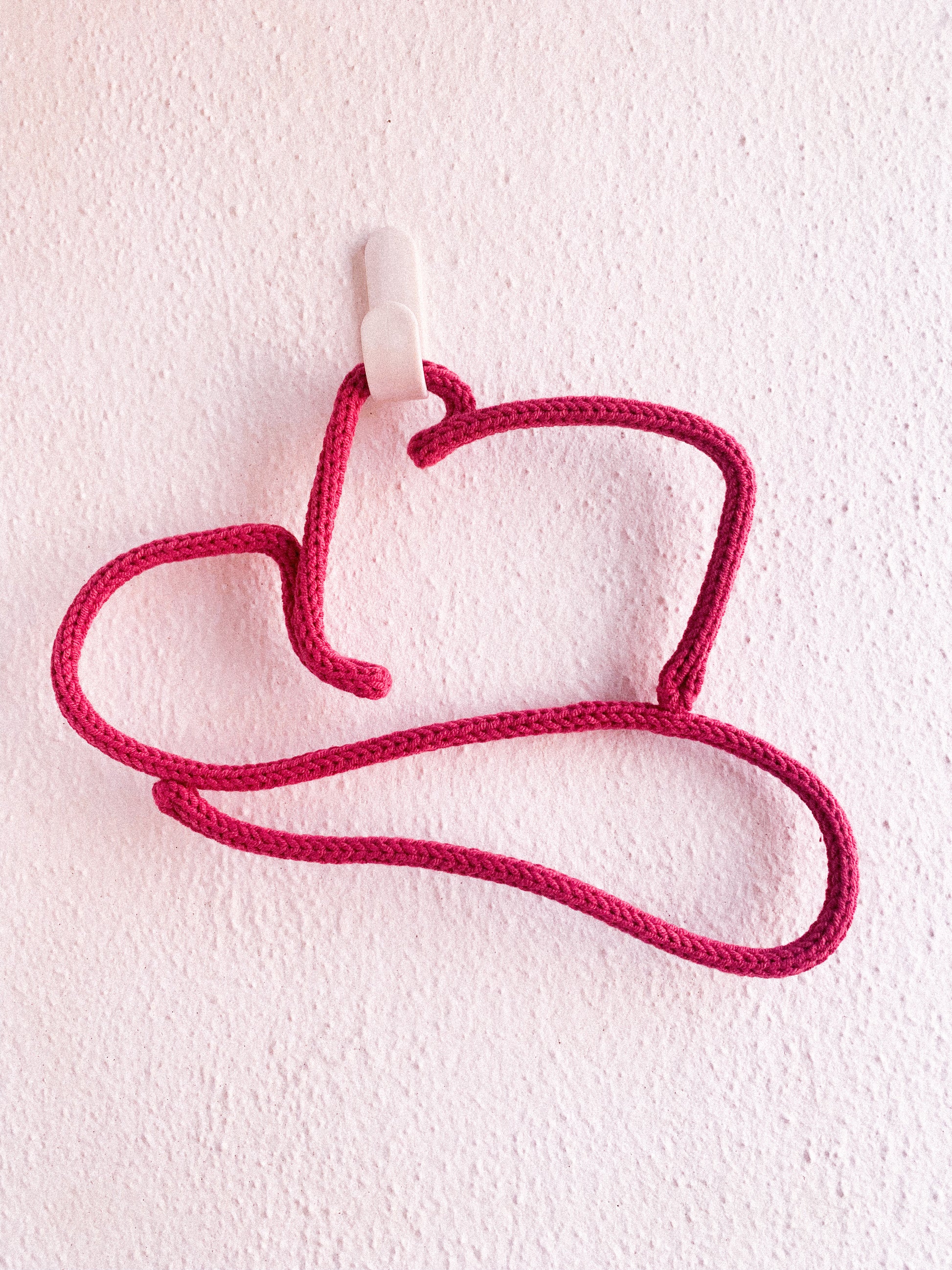 Feito com fio rosa choque, este chapéu de cowboy em tricotin é um convite para brincar, sonhar e viver pequenas aventuras cheias de ternura.