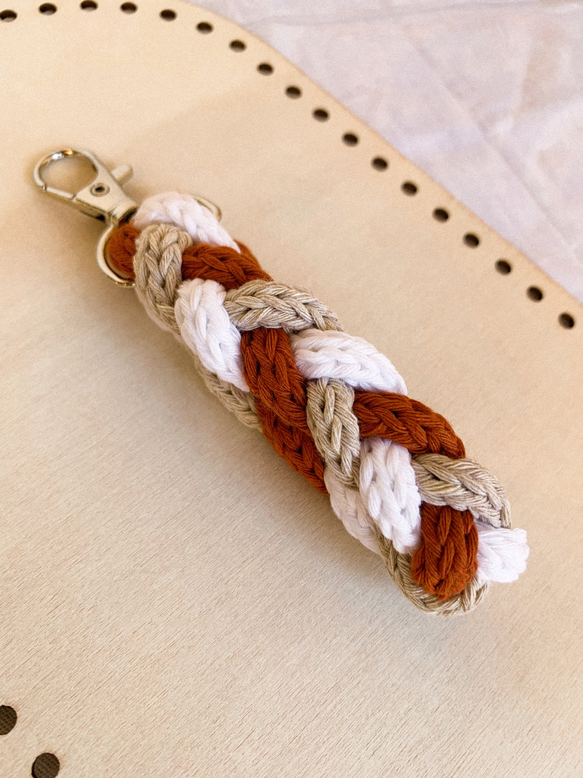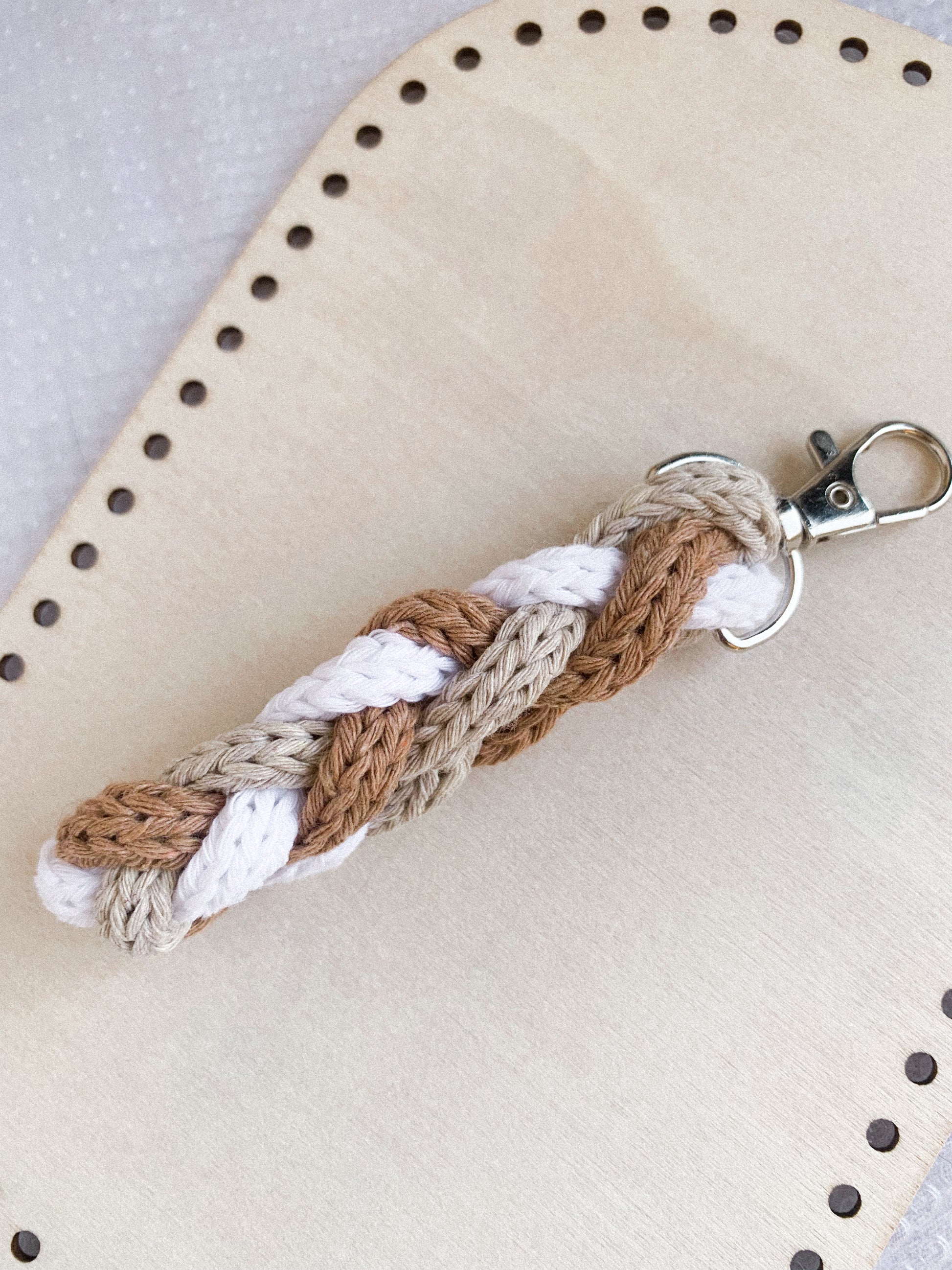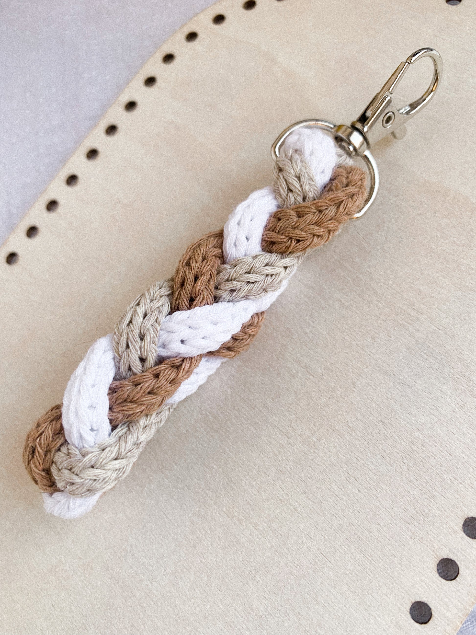 Os nossos porta-chaves em tricotin são feitos à mão, fio a fio, com uma trança suave que une três tons naturais.