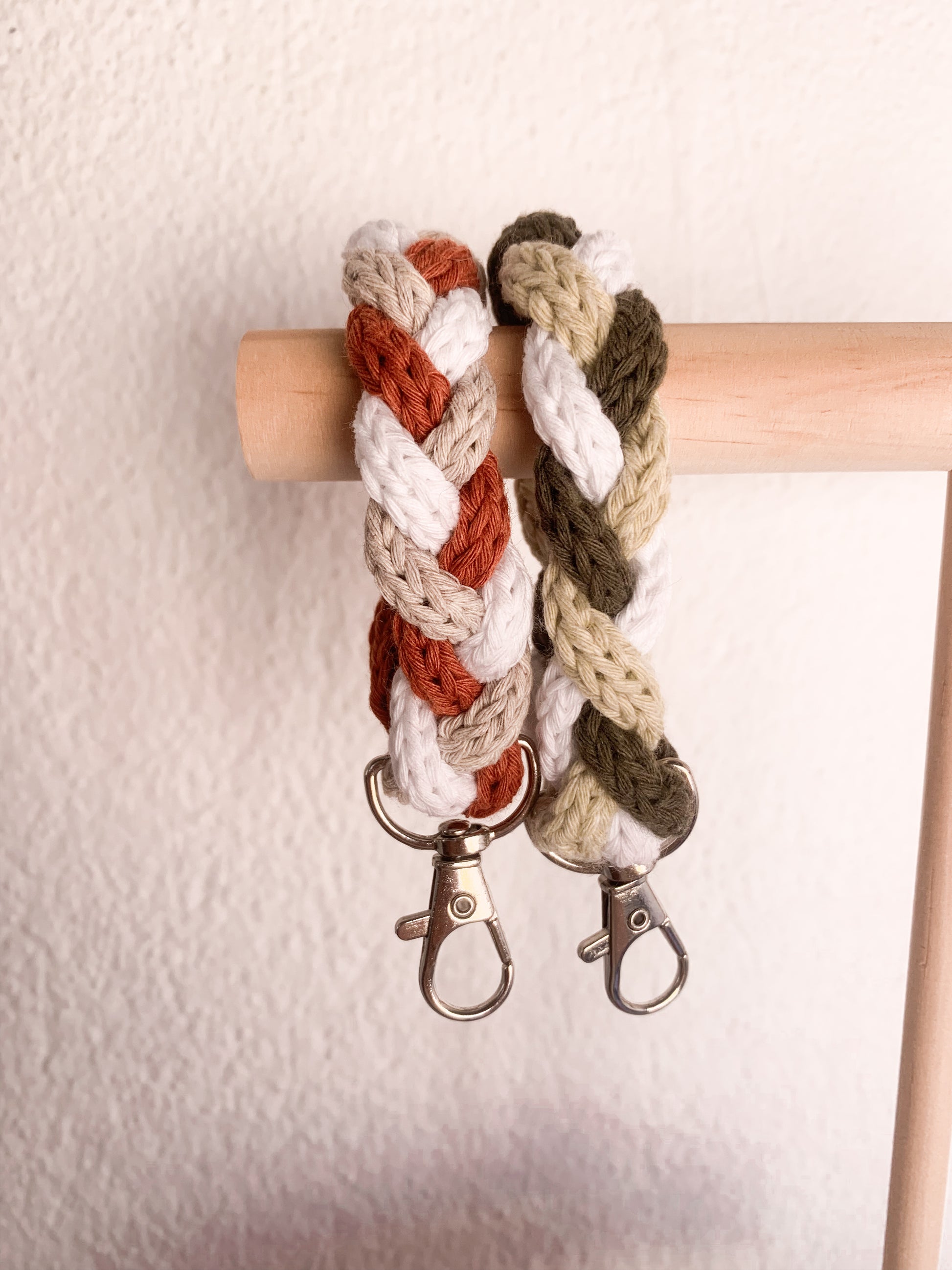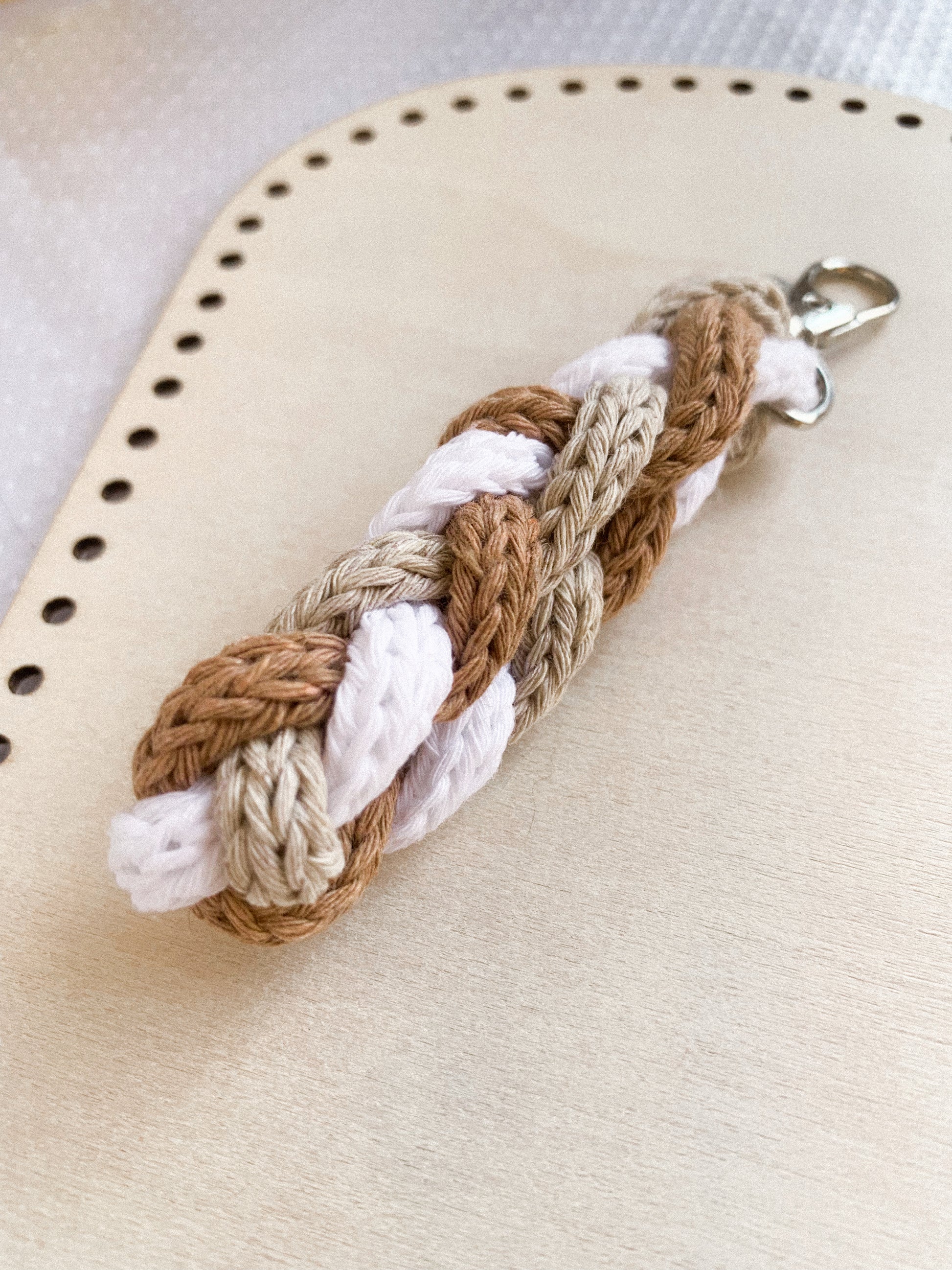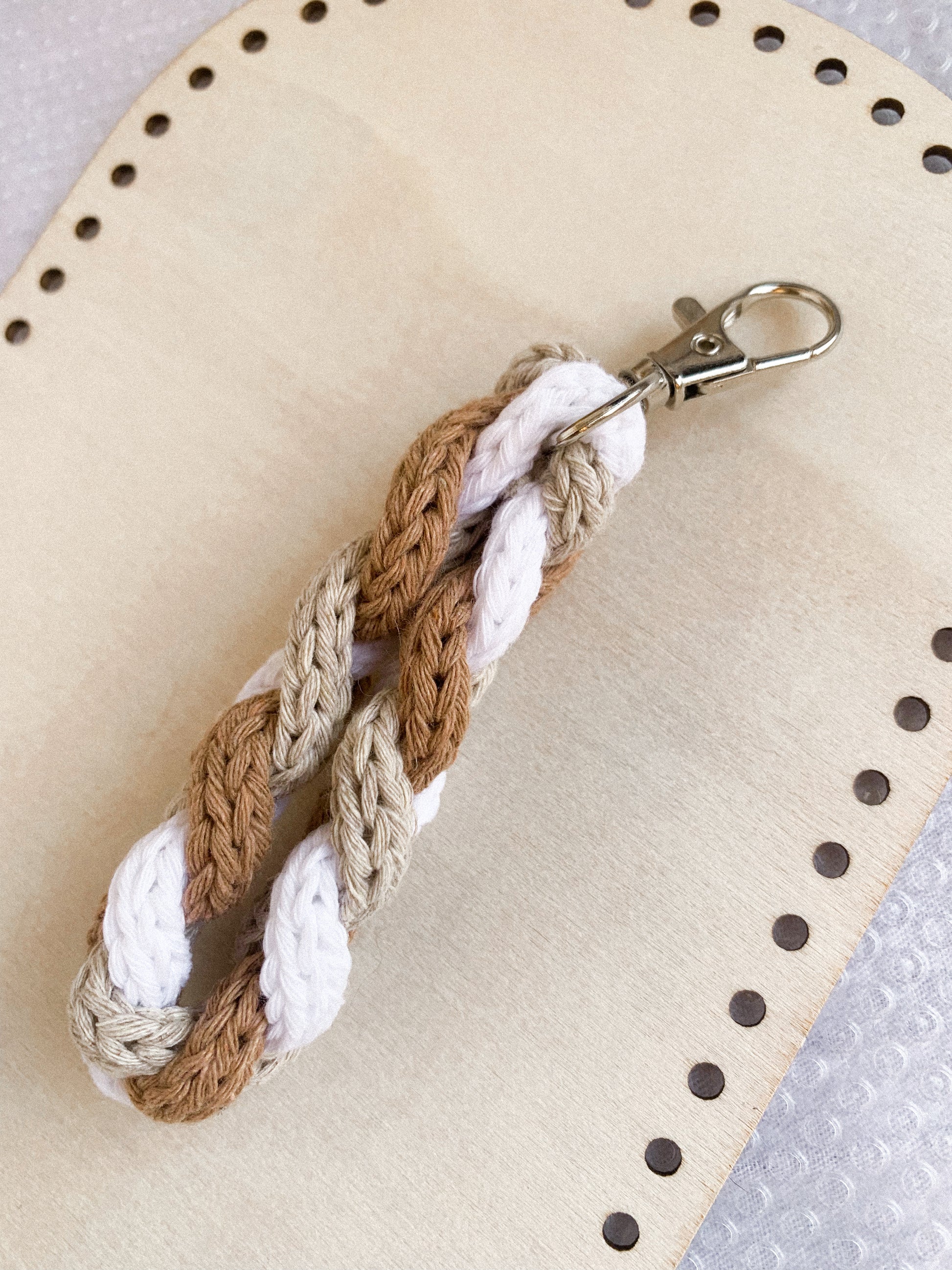 Os nossos porta-chaves em tricotin são feitos à mão, fio a fio, com uma trança suave que une três tons naturais.
