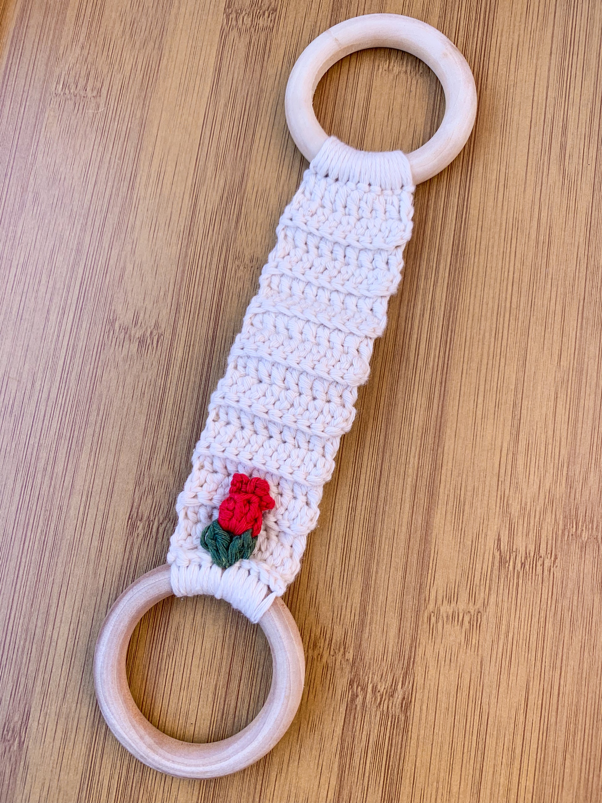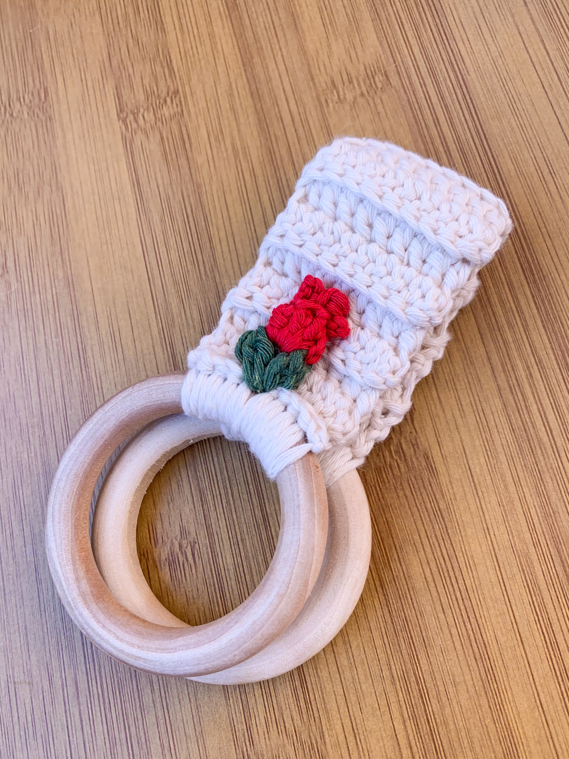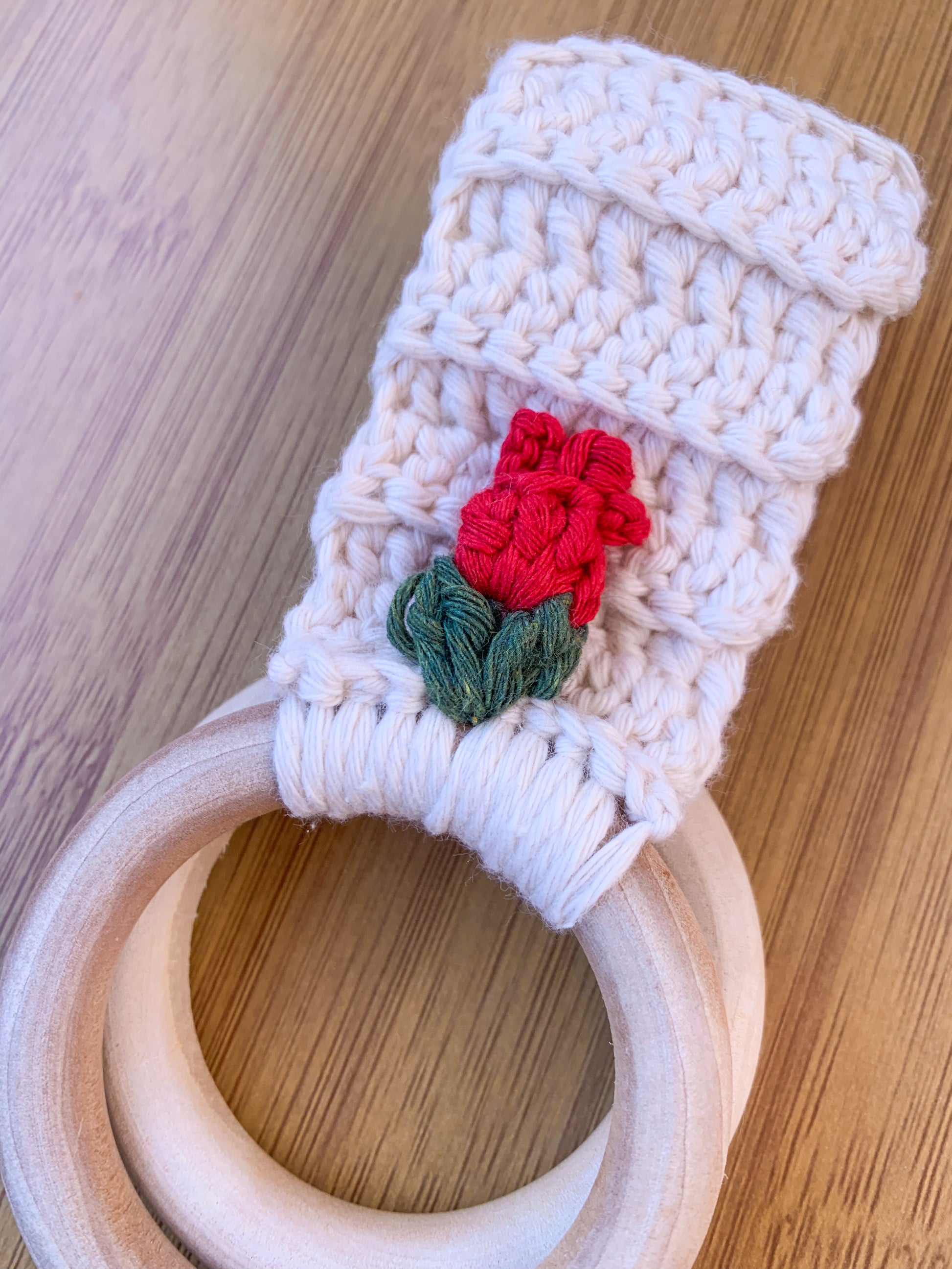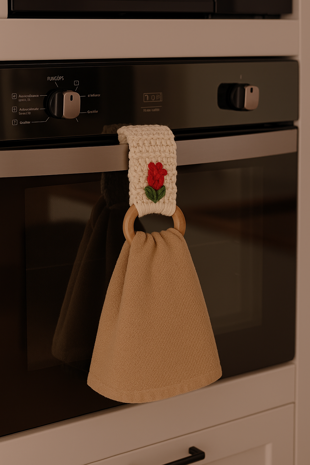O detalhe da flor bordada em vermelho com folhas verdes dá um toque único e elegante, tornando este porta-toalhas não apenas prático, mas também uma peça decorativa que valoriza qualquer cozinha.