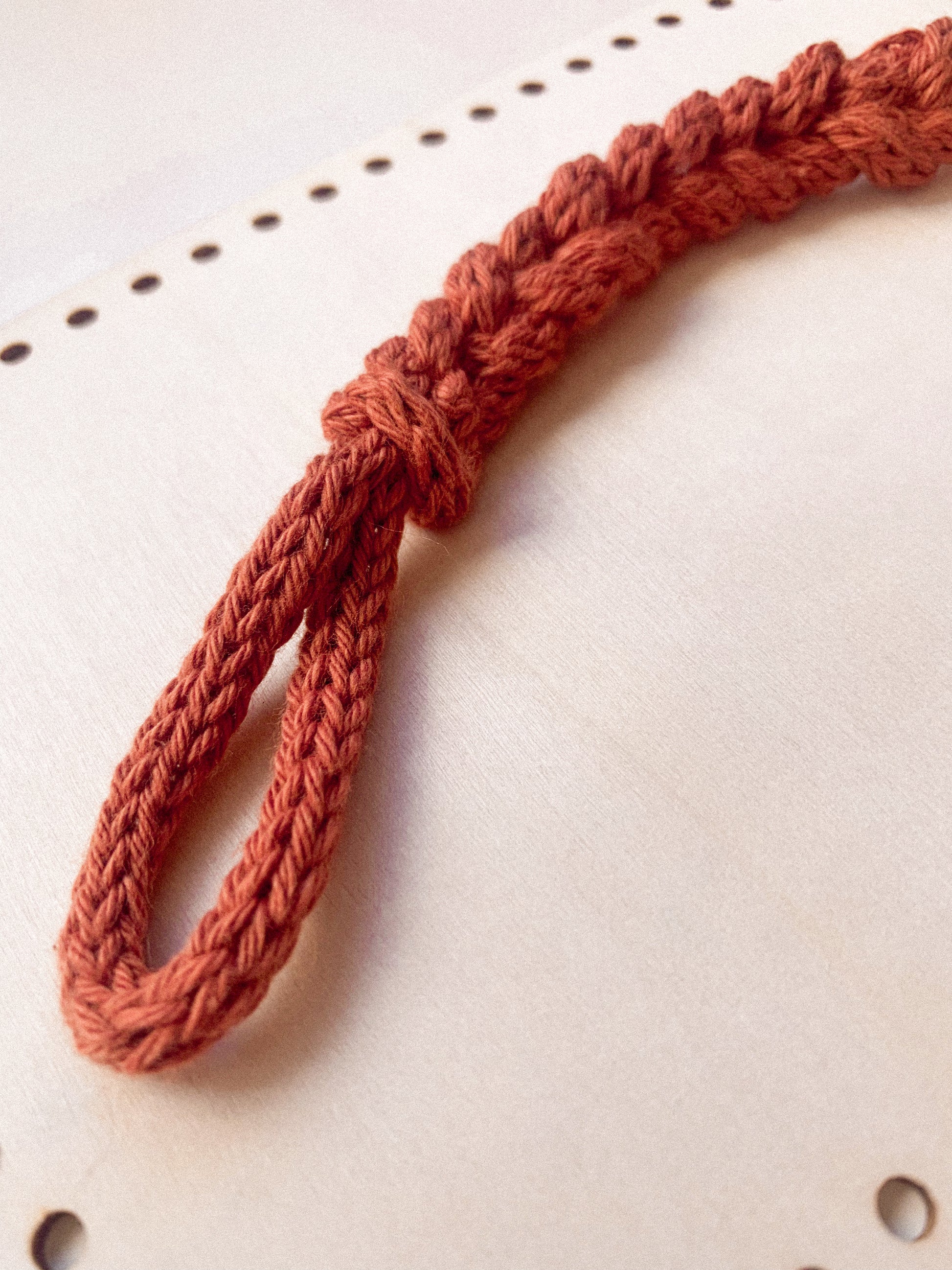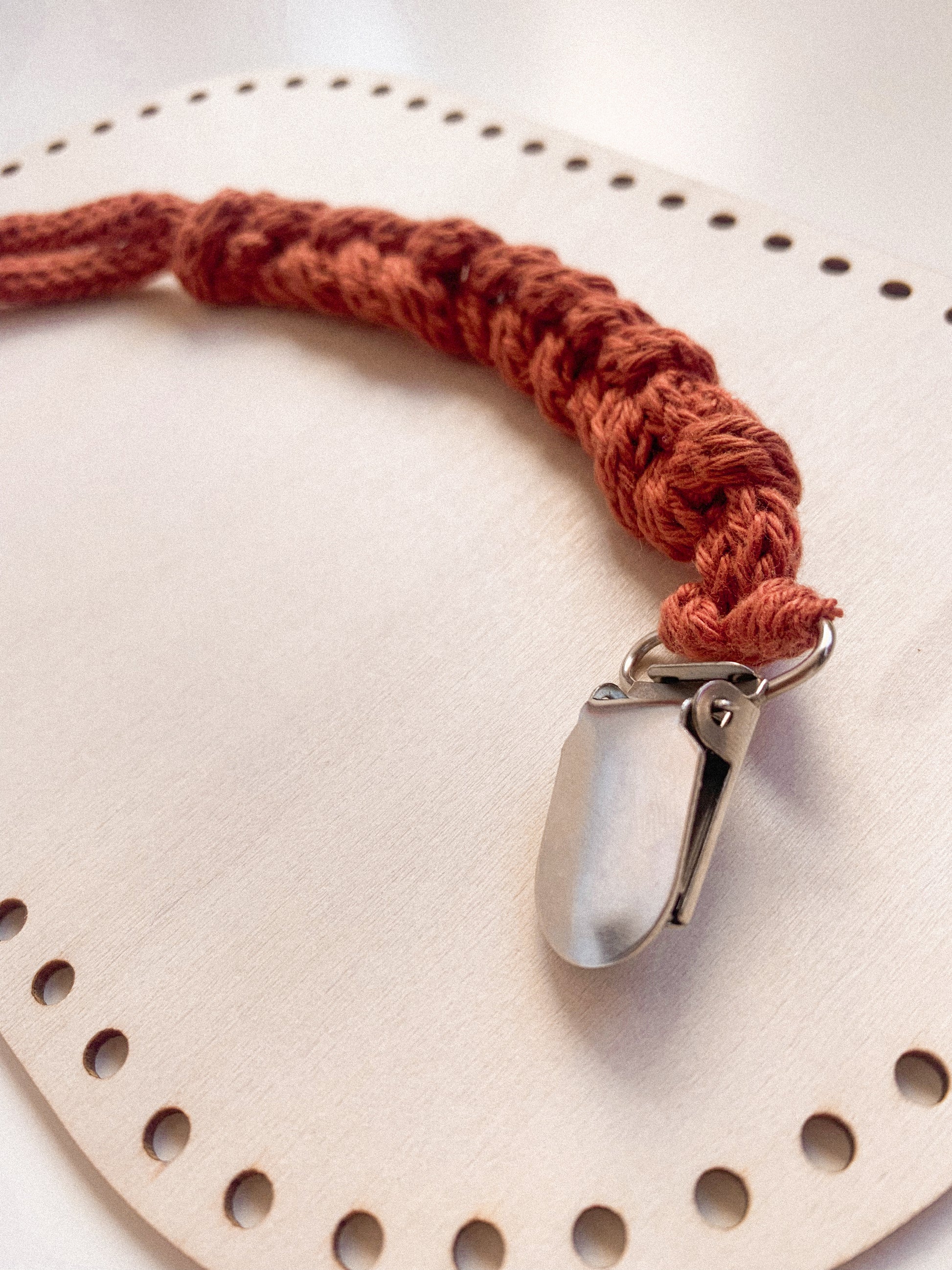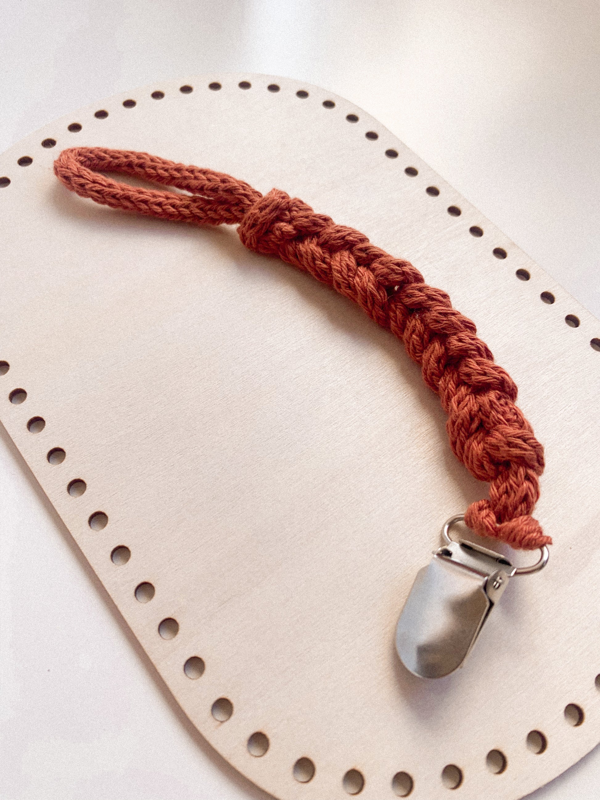 Prendedor de chucha feito à mão com fio de algodão, em tom terracota.